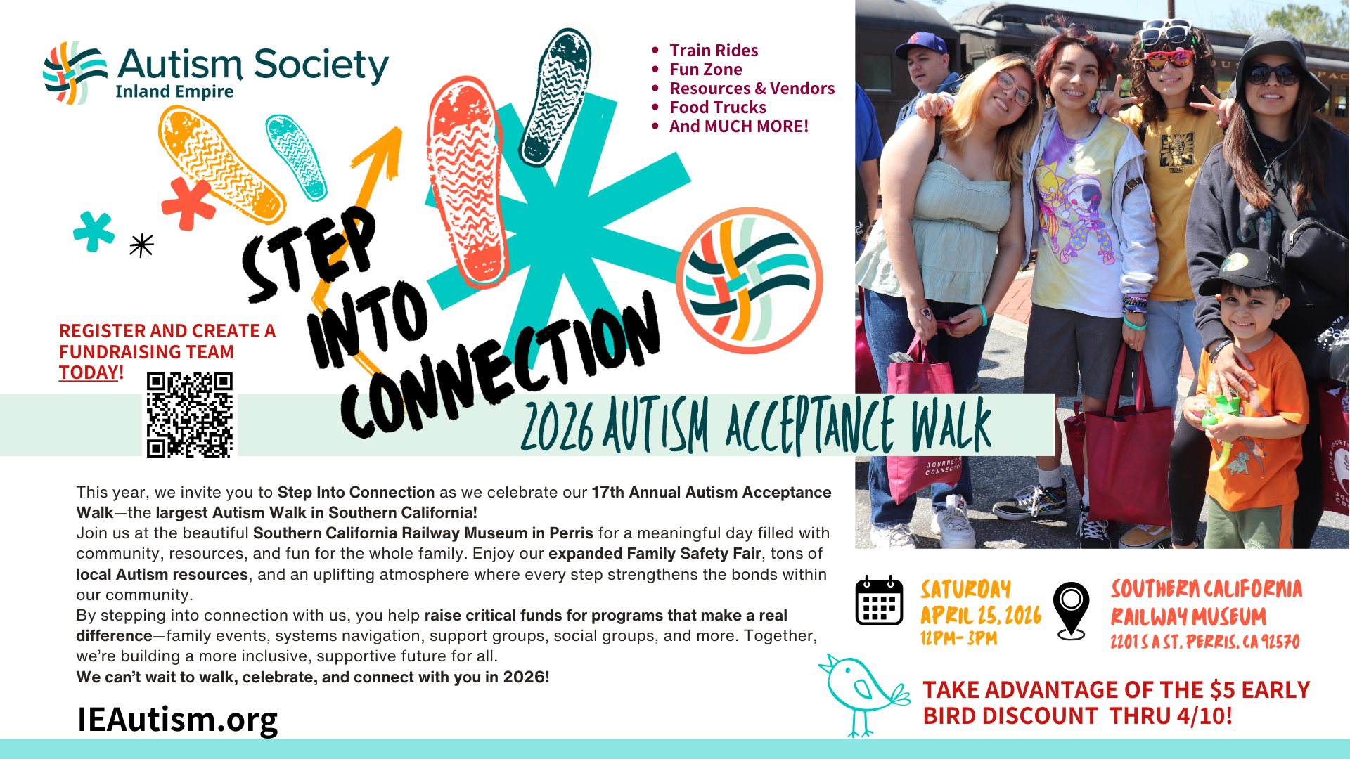 Únase a nosotros en la Caminata de Aceptación del Autismo "Step into Connection", una recaudación de fondos centrada en la comunidad que celebra el autismo, la inclusión y la pertenencia. Esta significativa caminata reúne a personas, familias, amigos y aliados para concienciar, comprender y apoyar a las personas autistas de nuestra comunidad.