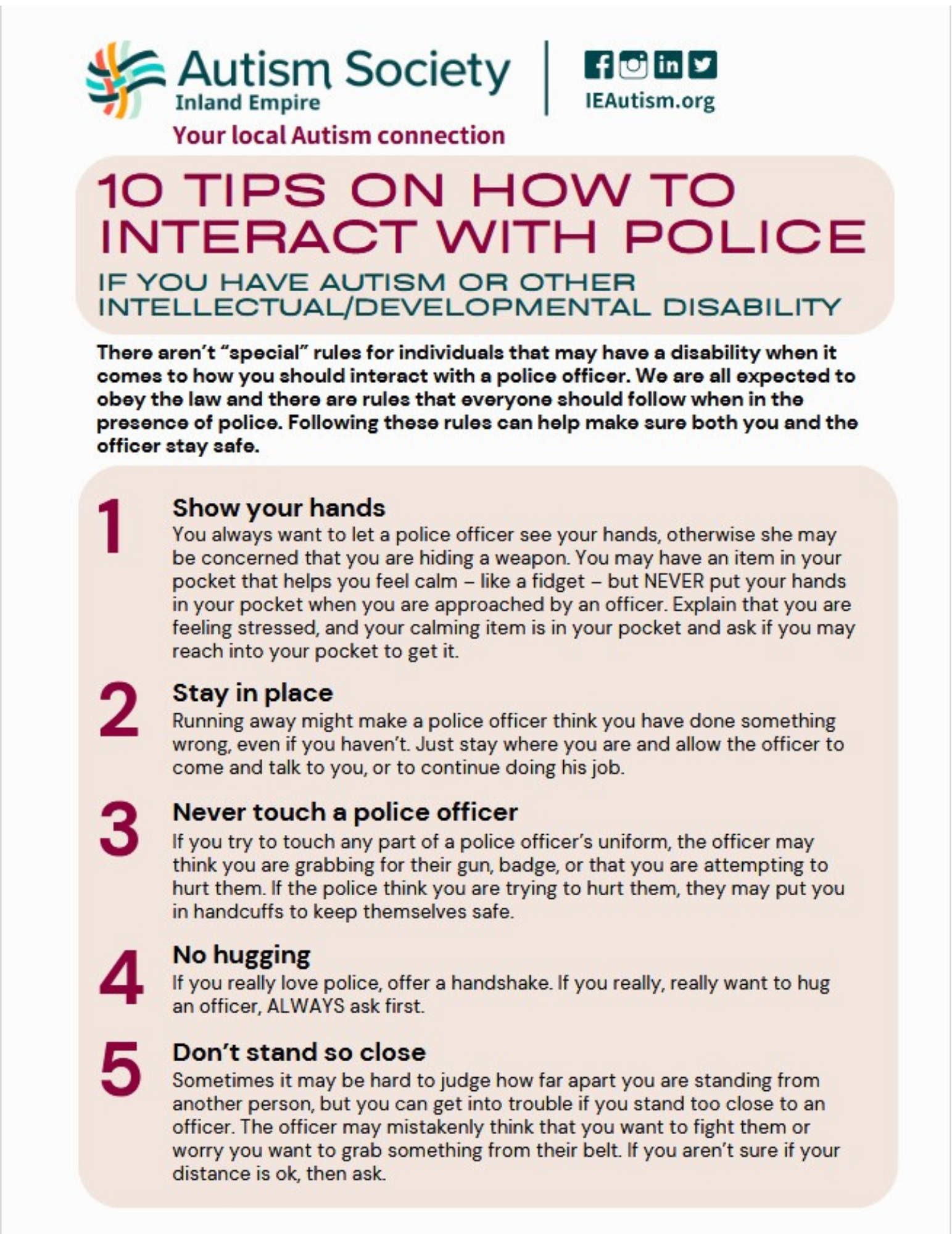 Las interacciones con la policía pueden ser estresantes para cualquiera, especialmente para las personas con autismo o discapacidad intelectual y del desarrollo (IDD). Esta página proporciona herramientas para que tanto las personas como las familias puedan tener encuentros positivos y seguros con los agentes de policía a través de la preparación, la comunicación y la conexión.