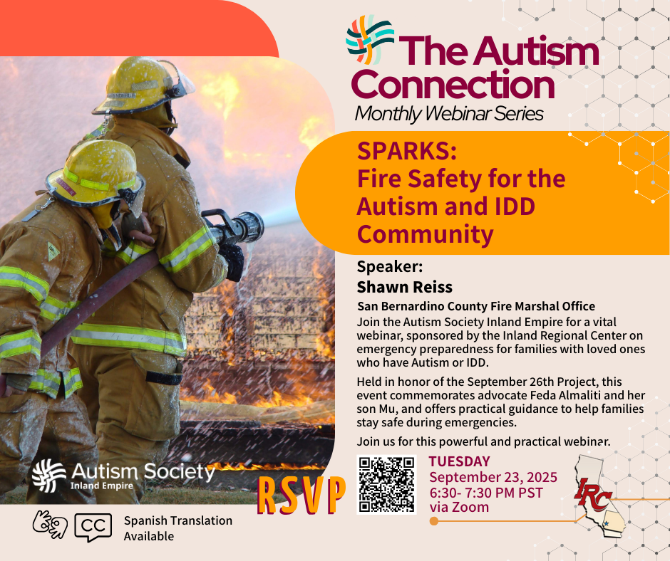 The Autism Society Inland Empire along with the Inland Regional Center is sponsoring this informative webinar. Emergencies don’t wait until we’re ready—and for families with loved ones who have Autism or intellectual and developmental disabilities (IDD), the stakes can be even higher. In honor of the September 26th Project, which commemorates the lives of Autism advocate, Feda Almaliti, and her son Mu, who tragically died in a house fire, we invite you to join us for a powerful and practical webinar. Shawn Reiss, San Bernardino County Fire Marshal Office, will share life-saving strategies tailored to the unique needs of our community. Even if you think you’re prepared, this session will offer insights you may not have considered—because preparation isn’t just about being ready, it’s about being safe. Let’s honor Feda and Mu by taking action to protect our families. One hour could make all the difference. If you require a close caption service or an American Sign Language interpreter, please send an email with the event title, date, and time to our Program Coordinator, Anel Ibarra, [email protected] at least seven business days before the webinar is to take place.