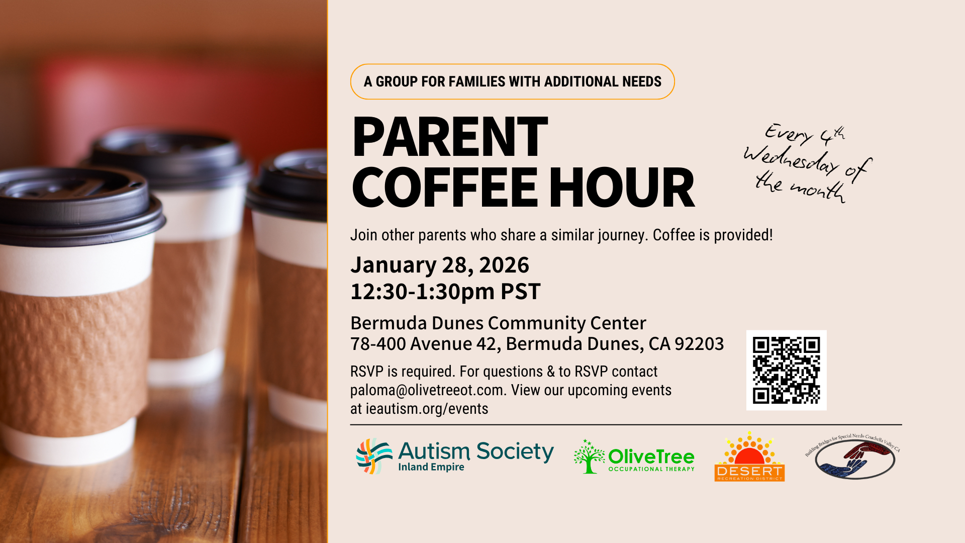 Parenting special needs children and adults can bring immense joy but can also bring unique challenges. Come share your journey with other parents who get it, as well as share resources. Coffee provided. For questions or to register text/call 760-972-7089