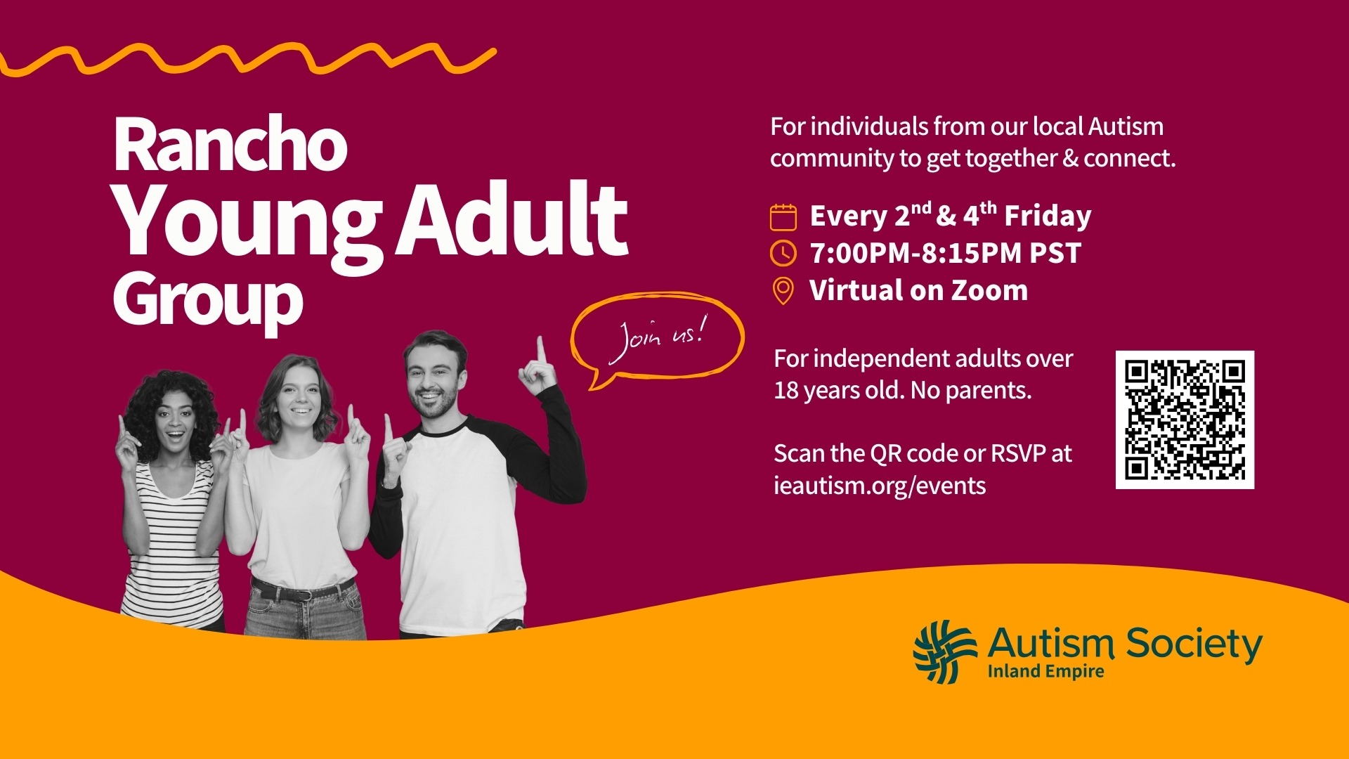 The Rancho Cucamonga Group will be hosting a virtual meet-up. This online event is intended for independent adults over 18 years old. No parents allowed. Please RSVP! |
